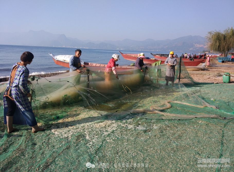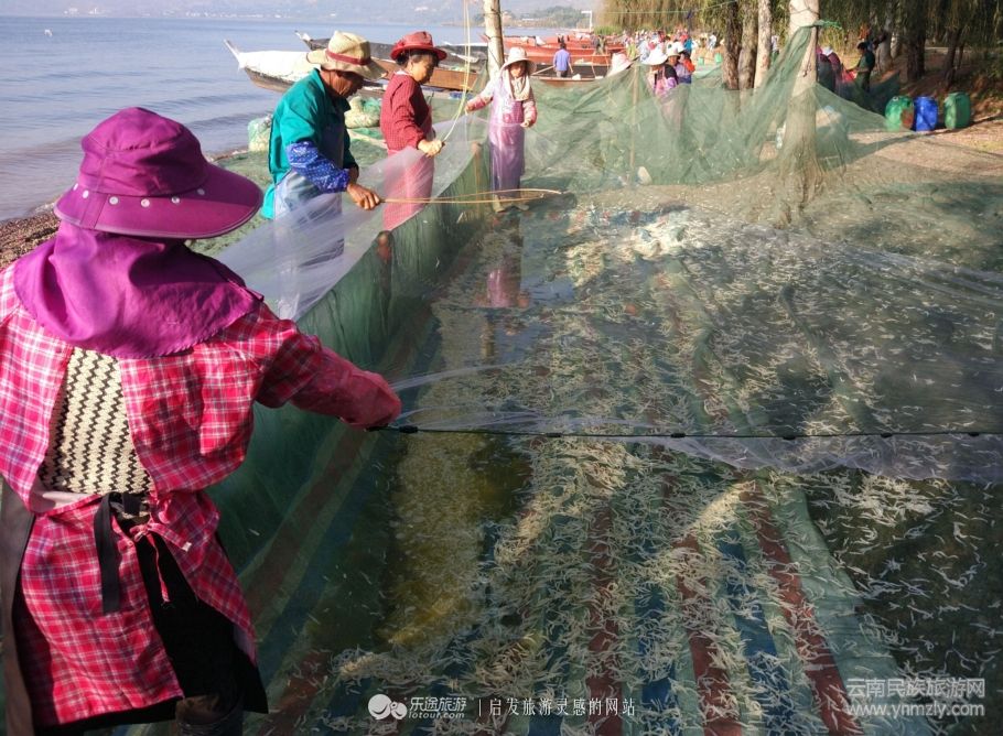 如果沒有更多奇妙的事也就枉為撫仙湖,知道了鱇蒗魚的捕魚方式還不算了解高原明珠,只有了解了撫仙湖銀魚是如何從浩瀚的湖水里來到餐桌上,才算一飽眼福,銀魚因?yàn)槌驳倪m應(yīng)性和繁殖能力在撫仙湖是可以定期捕撈的,夜晚漁民將網(wǎng)撒在湖里,開啟燈光誘捕銀魚,早晨開始起網(wǎng),看漁民們手持魚拍不斷地?fù)舸驖O網(wǎng),小小的銀魚上下紛飛,最終落下來,越積越多,男男女女在勞作中猶如從事藝術(shù)表演,有韻律,有意境,有歡樂,撫仙湖畔的銀魚捕撈就是一幅風(fēng)情畫。