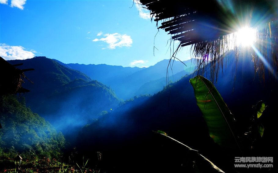 山頂緩緩升起,射出一縷縷光線。被晨霧打濕了的嫩草,花瓣上還留著昨夜的凝露。遙望霧紗飄逸的青