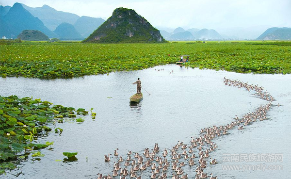 “蕩柳葉輕舟,賞萬畝荷花秀色;游地下暗河,觀洞里乾坤;登青龍山頂,攬山水田園勝景;進民族村寨,品民俗風(fēng)情神韻。”飽餐過農(nóng)家的特色小菜、喝過撒尼人自釀的小鍋酒,歌聲、笑聲、喝彩聲響徹云霄,山林和仙人湖也為之震撼了,人與自然達到了和諧的境界。那綿延百里的荷花園和充滿靈氣的湖水,總能引來游客們的驚嘆。普者黑無疑是“休閑天堂”“浪漫水鄉(xiāng)”,也是中外游客觀賞和研究荷花的勝地。(圖片:丘北縣委宣傳部)(錦年光影)