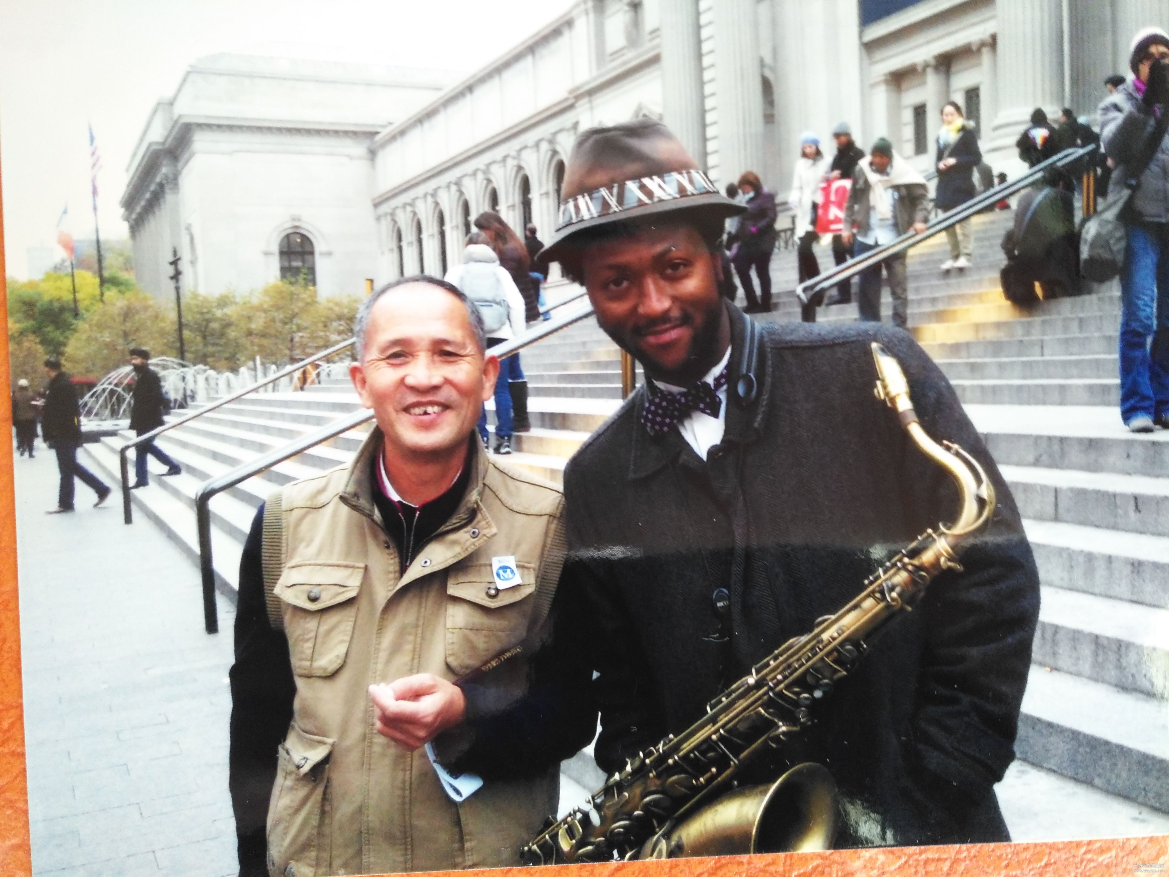 逛完紐約大都會(huì)后,剛出門,一個(gè)熟悉的旋律傳入他耳膜——《茉莉花》。演奏者是一位黑人年輕人。“你好!”不等王國(guó)運(yùn)開口,年輕人一口流利的普通話脫口而出。原來,吹薩克斯的年輕人曾在中國(guó)上海和深圳等多地呆過,算是“漢語(yǔ)通”了。那次,兩人聊了很長(zhǎng)時(shí)間,還在紐約博物館前合影留念。