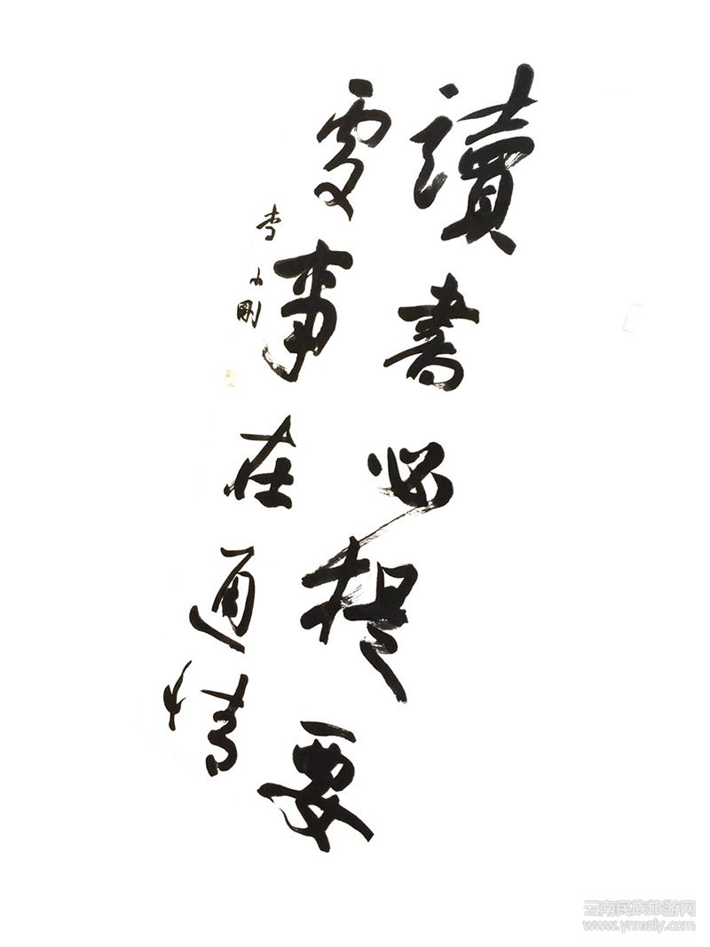 李小剛崇尚自然,敬畏自然,以一種淳樸的方式體悟自然,這樣的理念貫穿于他的書(shū)法藝術(shù)追求,故他的作品不著俗痕。他的作品,剛勁有力,骨力畢現(xiàn),又不乏鮮明的個(gè)性特色,往往把人帶入一種特有的意境,令人賞心悅目。