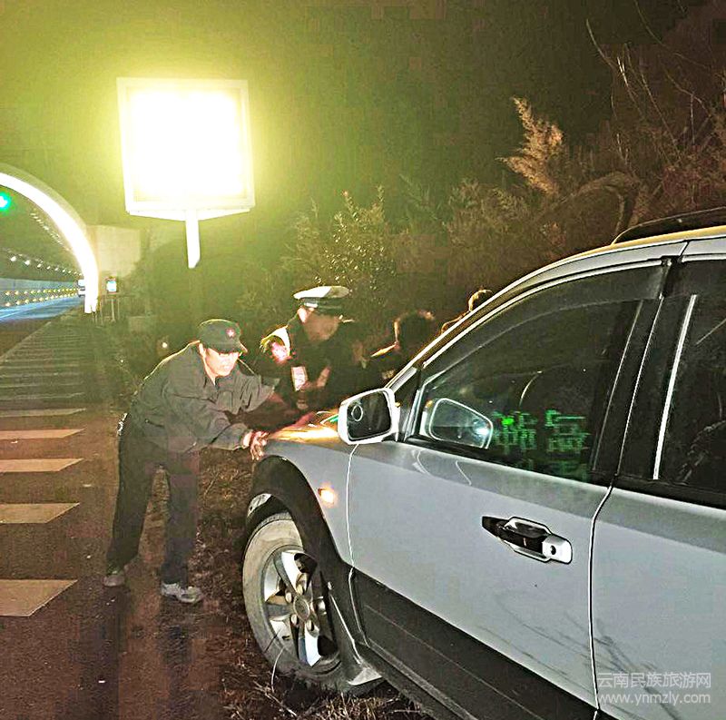 近日晚8時,大麗高速路交警大隊民警巡邏至大麗高速路大理往麗江方向K122路段雙龍隧道口時,發(fā)現(xiàn)一輛鄂籍小型越野汽車停在行車道內(nèi),未開啟應(yīng)急警示燈,也未放置任何警示標(biāo)志,存有較大安全隱患。見此情況,民警立即上前詢問,發(fā)現(xiàn)車邊站著手持電話的男子就是駕駛?cè)耍谂赃叺氖瞧涓赣H,車內(nèi)坐著的是駕駛?cè)说哪赣H及其妻子,妻子懷中還抱著一個正在哭鬧的嬰兒。
