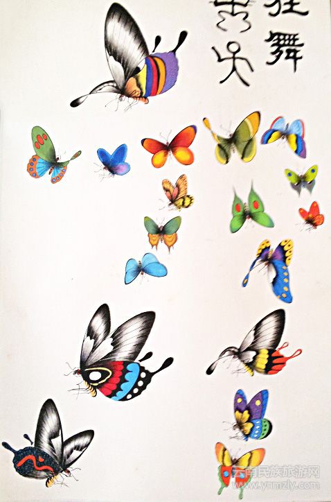 李麗通過各有特色的“蝴蝶東巴民族藝術畫”,在傾瀉胸中情懷,一吐豪氣。“蝴蝶東巴民族藝術畫”是提供她借以發(fā)揮的對象。因為字中有畫、畫中有字,正好具備了別的物象所不能替代的情感。人們可以在她的近作上感受到各種精神內(nèi)容,寄托豐富的情懷。無論是從造型的舒張之間、力美和節(jié)律的和諧;抑或是從造型變化、布局恰當; 還是從符號造型、概括字所具有的強健、敦厚、俊逸、神采于一體的特點,都似乎是上蒼賦予人世間的尤物。畫家在經(jīng)意和不經(jīng)意間的題材求取,都能出其性靈溝通。