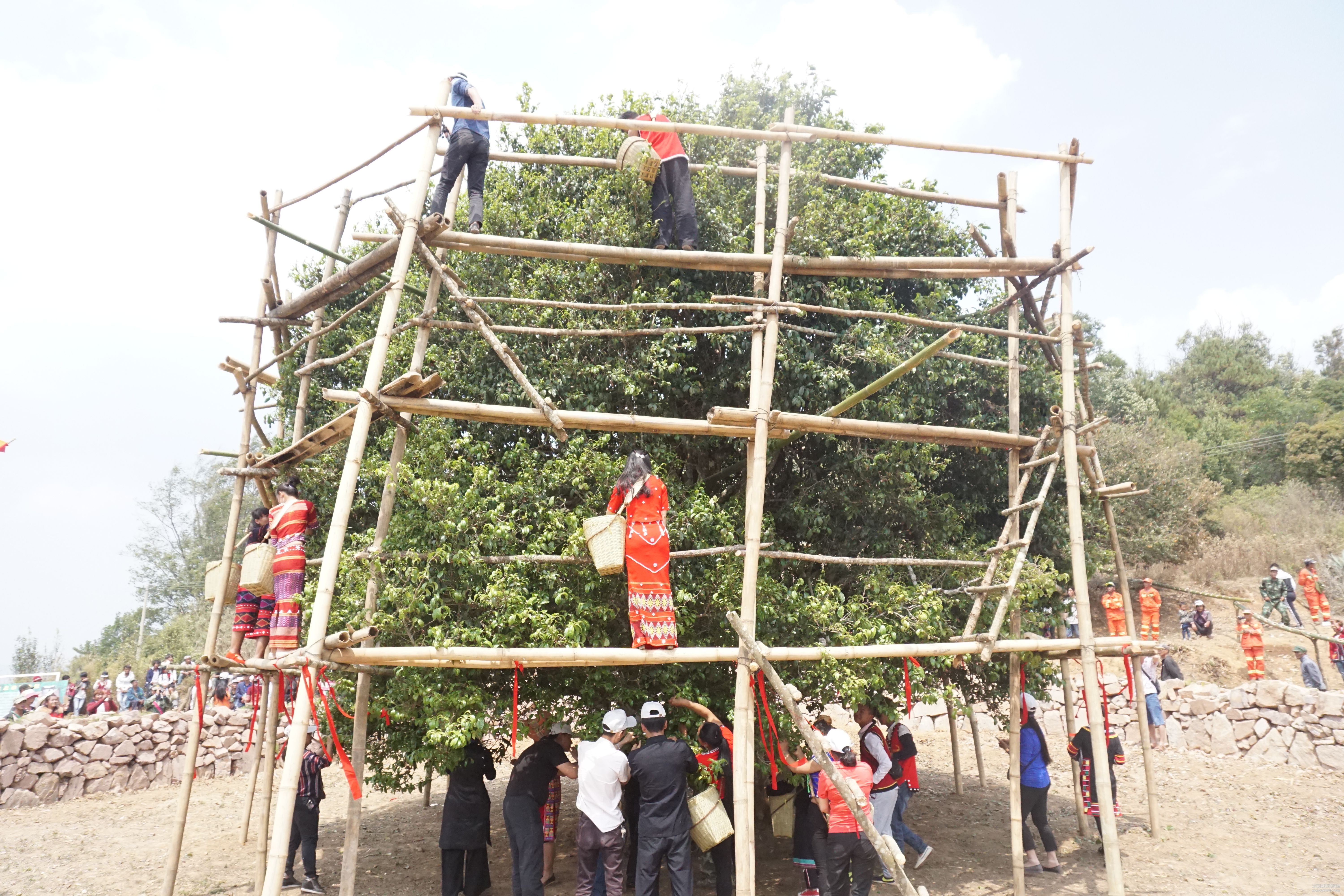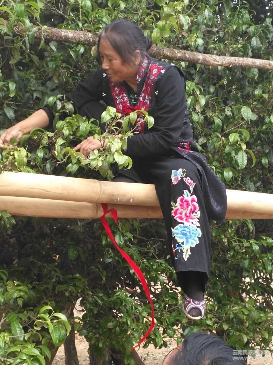 隨后,老人們和客人還用竹筒接引山泉,圍著古茶樹澆灌,這個儀式是向茶神獻(xiàn)水,期盼古茶生機勃勃,滋潤后人。在悠揚的佤族樂曲聲中,采茶妹和采茶哥攀上高高的架子,在外圍采摘茶后的第一抹新綠,很多客人也興致勃勃地加入了采茶行列。