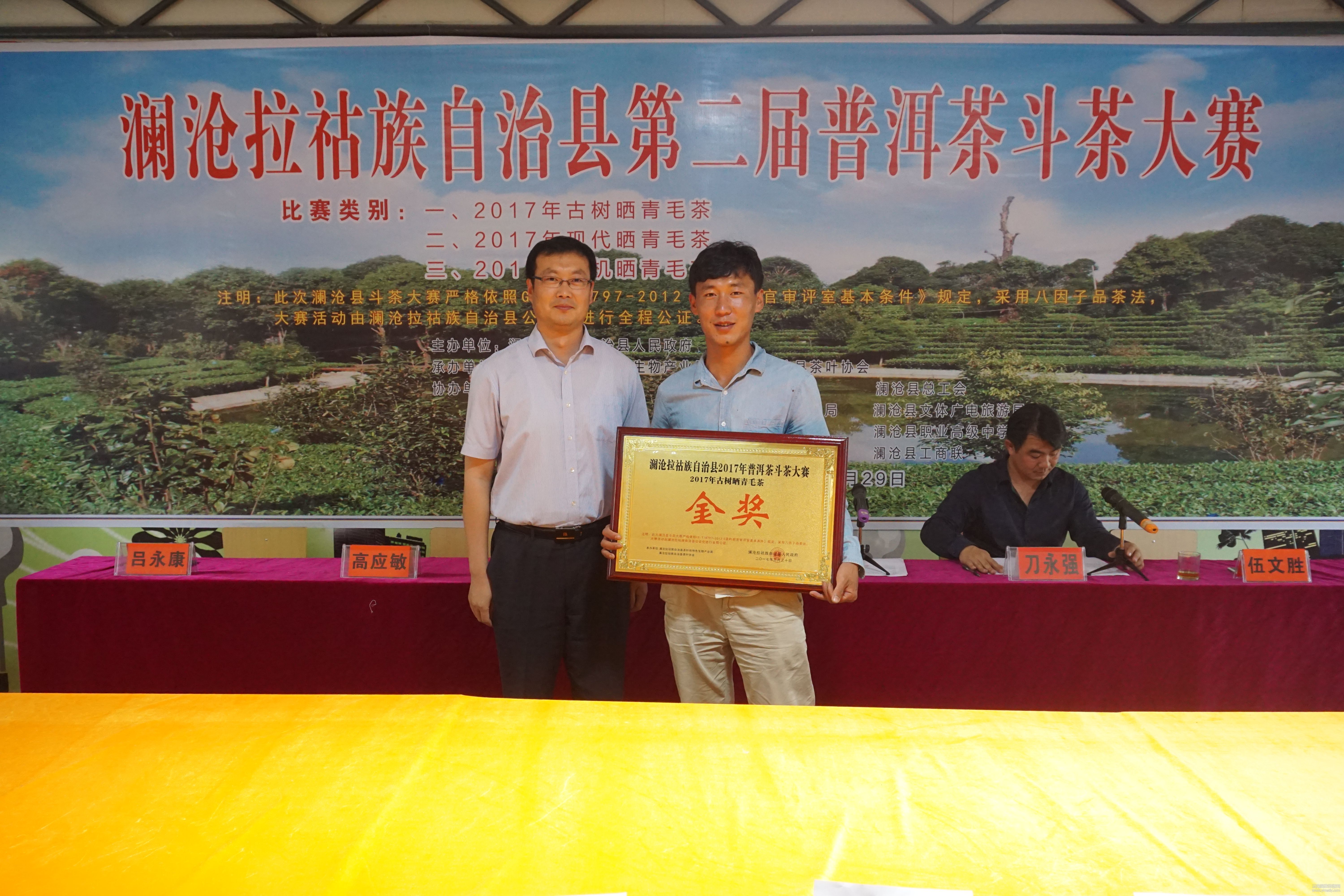 (l瀾滄縣委常委、縣人民政府副縣長張文韜為古樹曬青毛茶金獎獲得者頒獎)