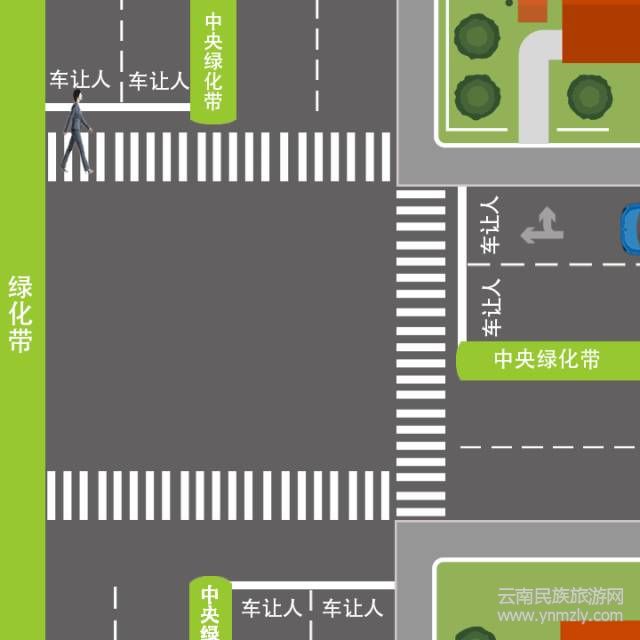 當(dāng)?shù)缆穬蓚?cè)有綠化帶,行人走斑馬線還未穿過綠化帶時(shí),緊貼綠化帶車道的車輛需要停車讓行;當(dāng)行人走斑馬線已穿過綠化帶時(shí),所有車道的車輛都必須停車讓行。