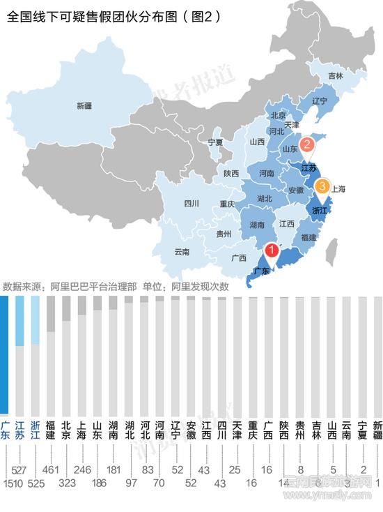 2016年阿里巴巴平臺(tái)治理部數(shù)據(jù)也顯示,全國(guó)線下可疑售假團(tuán)伙中,廣東、江蘇、浙江、福建這幾個(gè)省份情況較多。(如圖2)