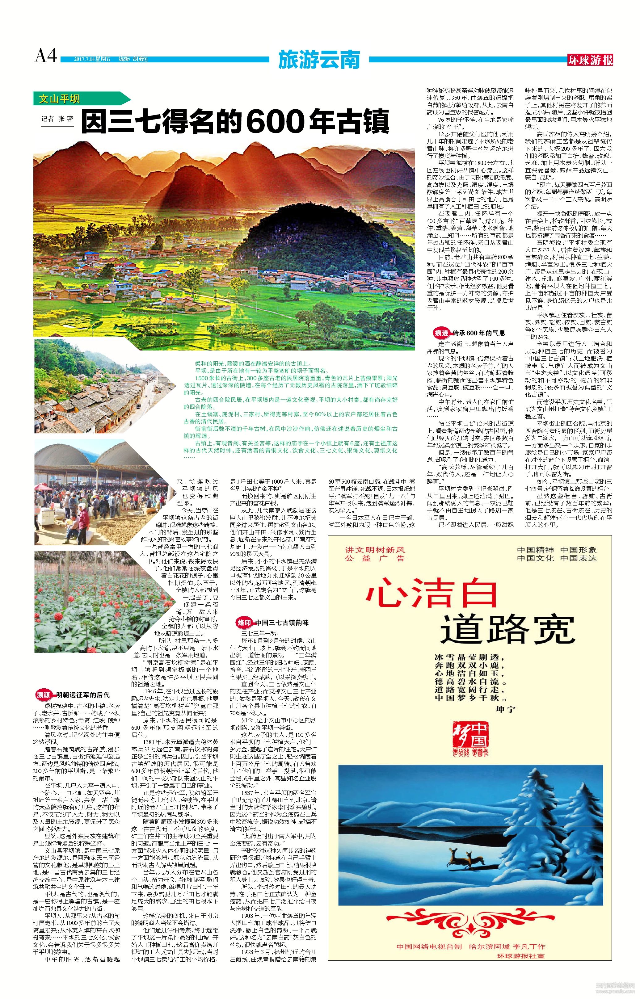 雖然這些柜臺(tái)、店鋪、古街前,已經(jīng)沒有了數(shù)百年前的繁華;但是三七還在、古街還在,歷史的煙云和輝煌還在一代代烙印在平壩人的心里。記者 張密 (文章來源環(huán)球游報(bào)2017年7月14日第1100期A4)
