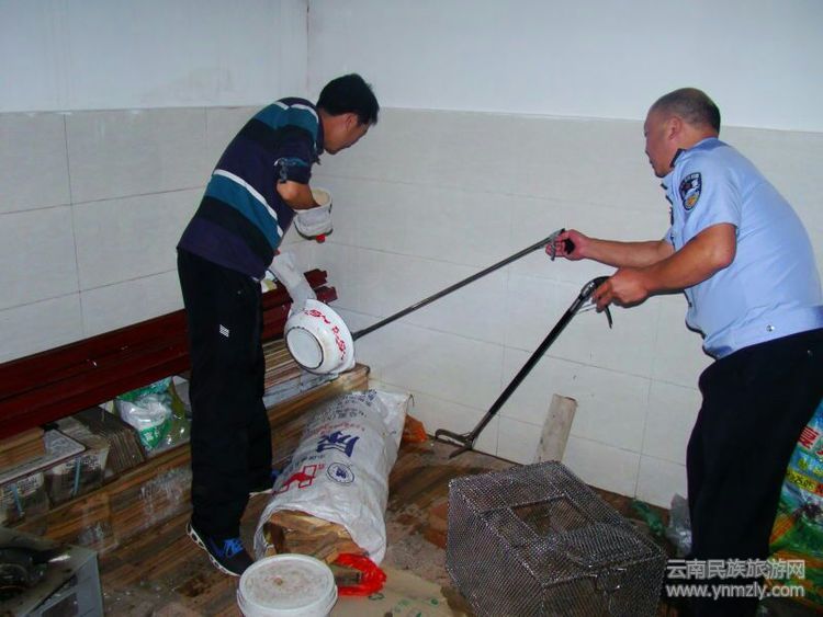接警后永仁縣森林公安局局長(zhǎng)劉喜立即帶領(lǐng)有豐富捕蛇經(jīng)驗(yàn)的民警帶上捕蛇工具前往現(xiàn)場(chǎng)處置。到達(dá)現(xiàn)場(chǎng)后,經(jīng)過(guò)二十分鐘的搜尋,終于在一個(gè)雜物間的角落里看見(jiàn)一條約有茶杯粗,昂著頭吐著信子的眼鏡蛇,見(jiàn)狀民警用蛇夾小心將其夾住放入蛇籠當(dāng)中,安全隱患解除,報(bào)警人連聲說(shuō)謝謝,感謝森林公安為他家消除危險(xiǎn),并打趣的說(shuō):“今天是彝族人民‘火把節(jié)’開(kāi)始的第一天,我們?nèi)疑舷露即┦⒀b,唱酒歌,祈福祝愿來(lái)年日子越來(lái)越紅火,這么大的眼鏡蛇也來(lái)我家湊熱鬧,看來(lái)來(lái)年要發(fā)財(cái)了。”
