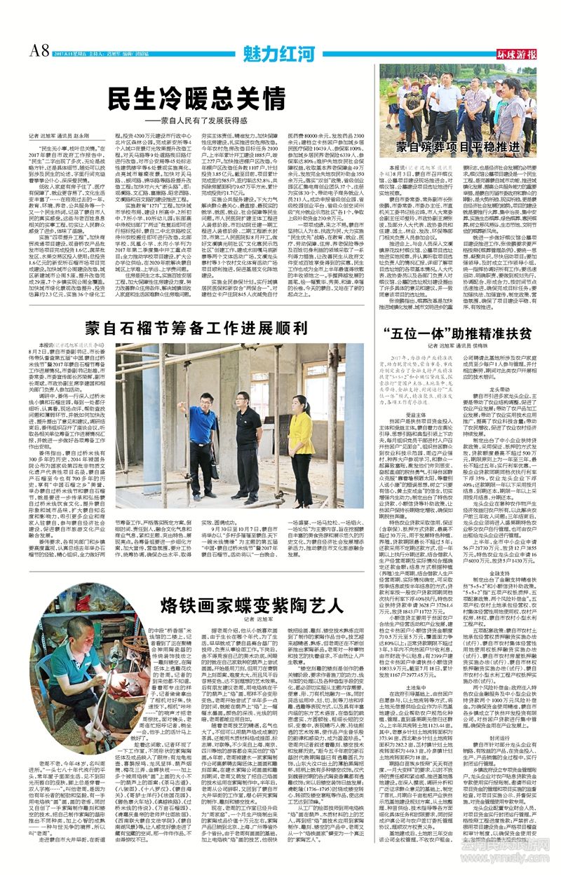 趁著這間歇,記者環(huán)視了一下工作室,不同形狀的紫陶陶坯體及成品映入了眼簾:有龍龜泡壺、喜鵲報(bào)鳴、龍鳳呈祥、葫蘆煙筒、梅花三弄、金蟬扶枝……加上多個(gè)被用烙鐵“畫”上畫的大小不一的葫蘆上的圖案:《茶馬古道》、《八駿圖》、《十八羅漢》、《蒙自海關(guān)》、《哥臚士洋行》《法國(guó)花園》、《碧色寨火車站》、《滇越鐵路》、《過(guò)橋米線的傳說(shuō)》、《萬(wàn)畝石榴園》、《清嘉慶皇帝的老師尹壯圖故居》、《西南聯(lián)大蒙自文法學(xué)院》、《蒙自南湖風(fēng)景》等。讓人感覺(jué)好像走進(jìn)了藏有寶藏的空間,那一件件作品,不由得驚嘆不已。