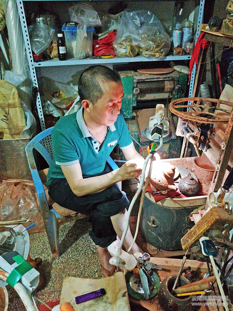 走進(jìn)蒙自市大井早街,在街道的中段“橋香居”米線館的二樓上,記者看到了正在聚精會(huì)神用陶瓷器的傳統(tǒng)裝飾技法之一雕刻鏤空,在陶坯體上透雕花紋的老周。記者的到來(lái)他都不知道,看著那專注的樣子,記者偷偷拿出了相機(jī)對(duì)好焦,快速按下。相機(jī)“咔咔……”的響聲才把老周驚擾。面對(duì)鏡頭,老周連忙招呼記者,稍坐一會(huì),他手上的活計(jì)馬上就好了。