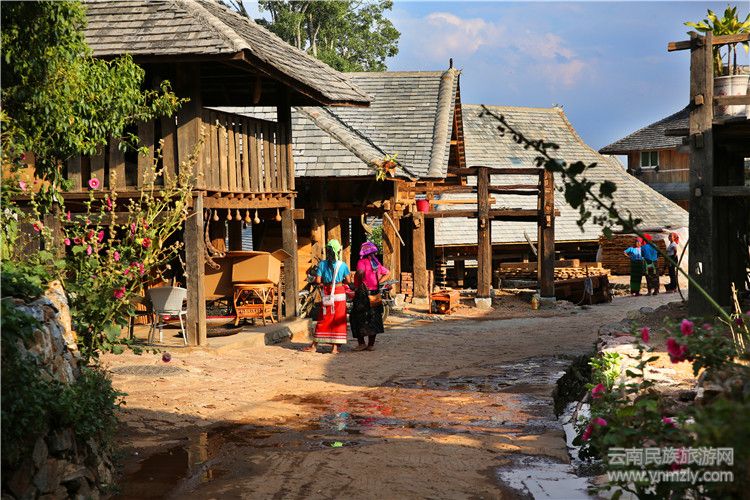 獨(dú)具布朗族建筑特點(diǎn)的橄欖式建筑,高低起落地掩映在蔥郁的芭蕉樹的影子里,古趣盎然。村內(nèi),有南門河、那耐河及許多流水潺潺的小箐穿村而過。