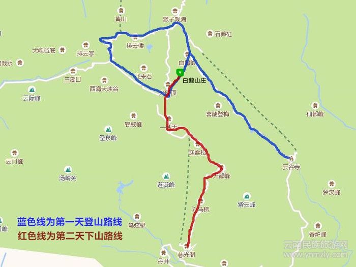 線路:黃山—白鵝嶺—黑虎松—猴子觀海—排云亭—飛來石—光明頂—天都峰—迎客松