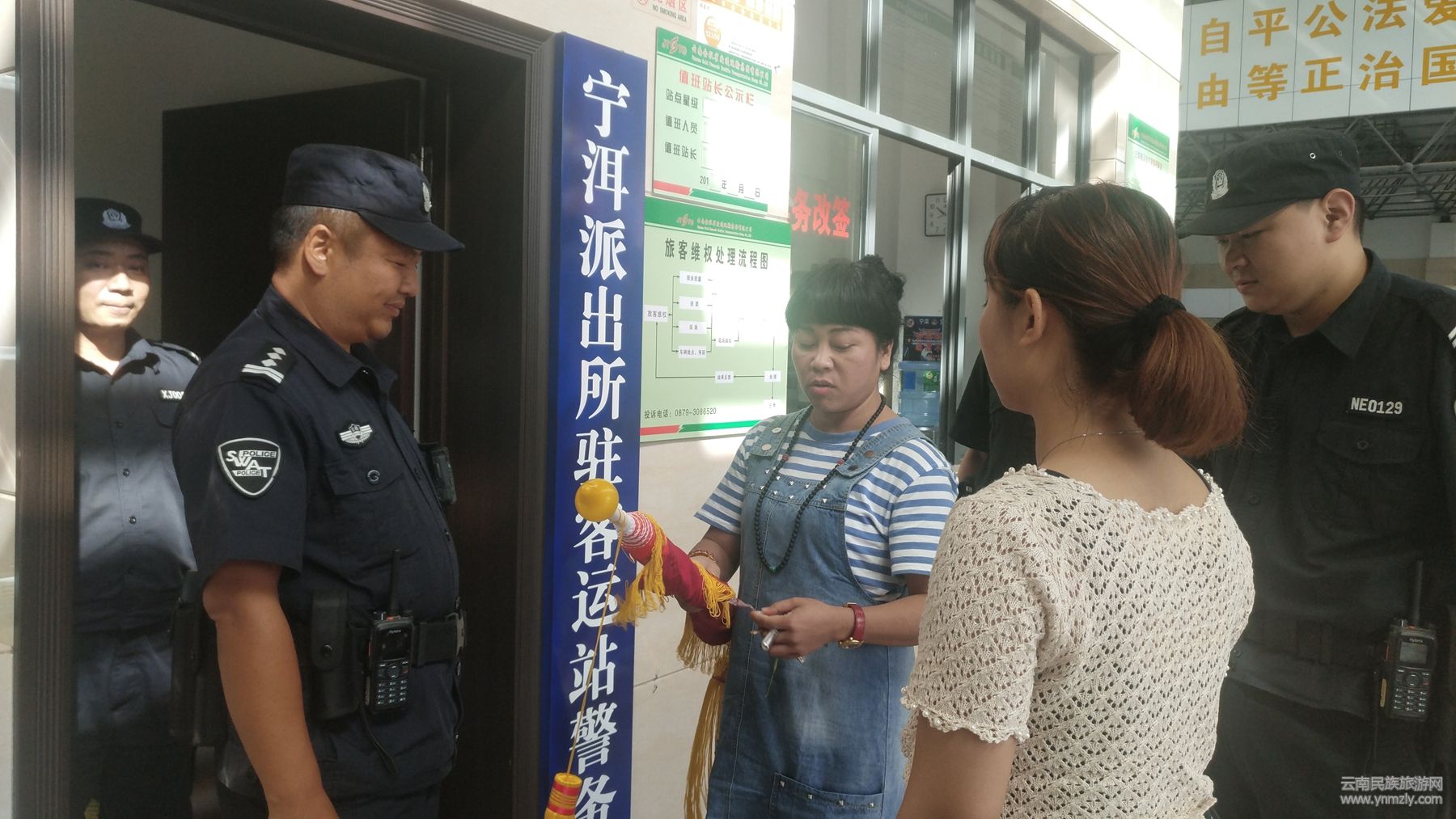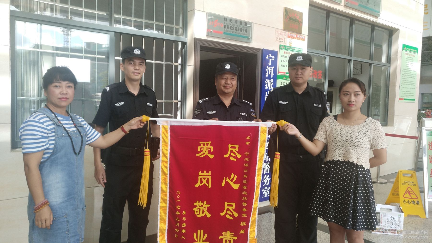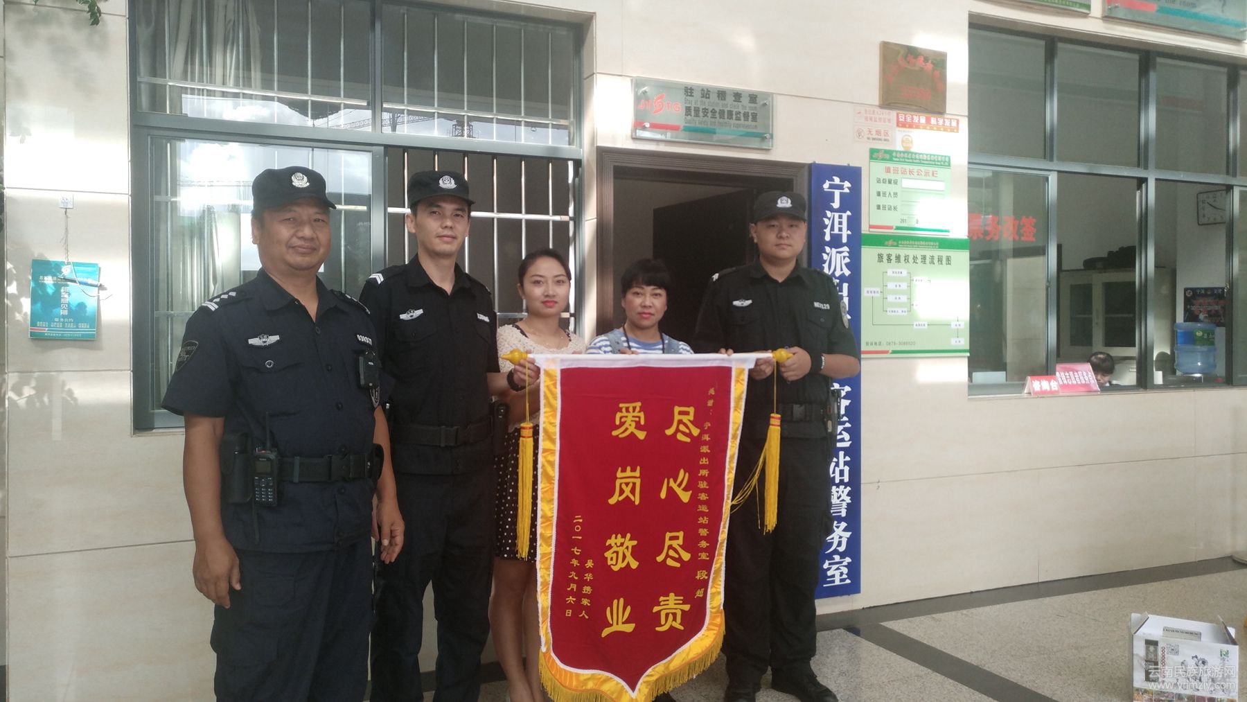 9月28日,尚女士與同伴一起走進寧洱汽車客運站警務(wù)室,將一面繡著“盡心盡責 愛崗敬業(yè)”的錦旗送給警務(wù)室民警協(xié)警手中,對警務(wù)室協(xié)警段超給予的幫助表示衷心的感謝。