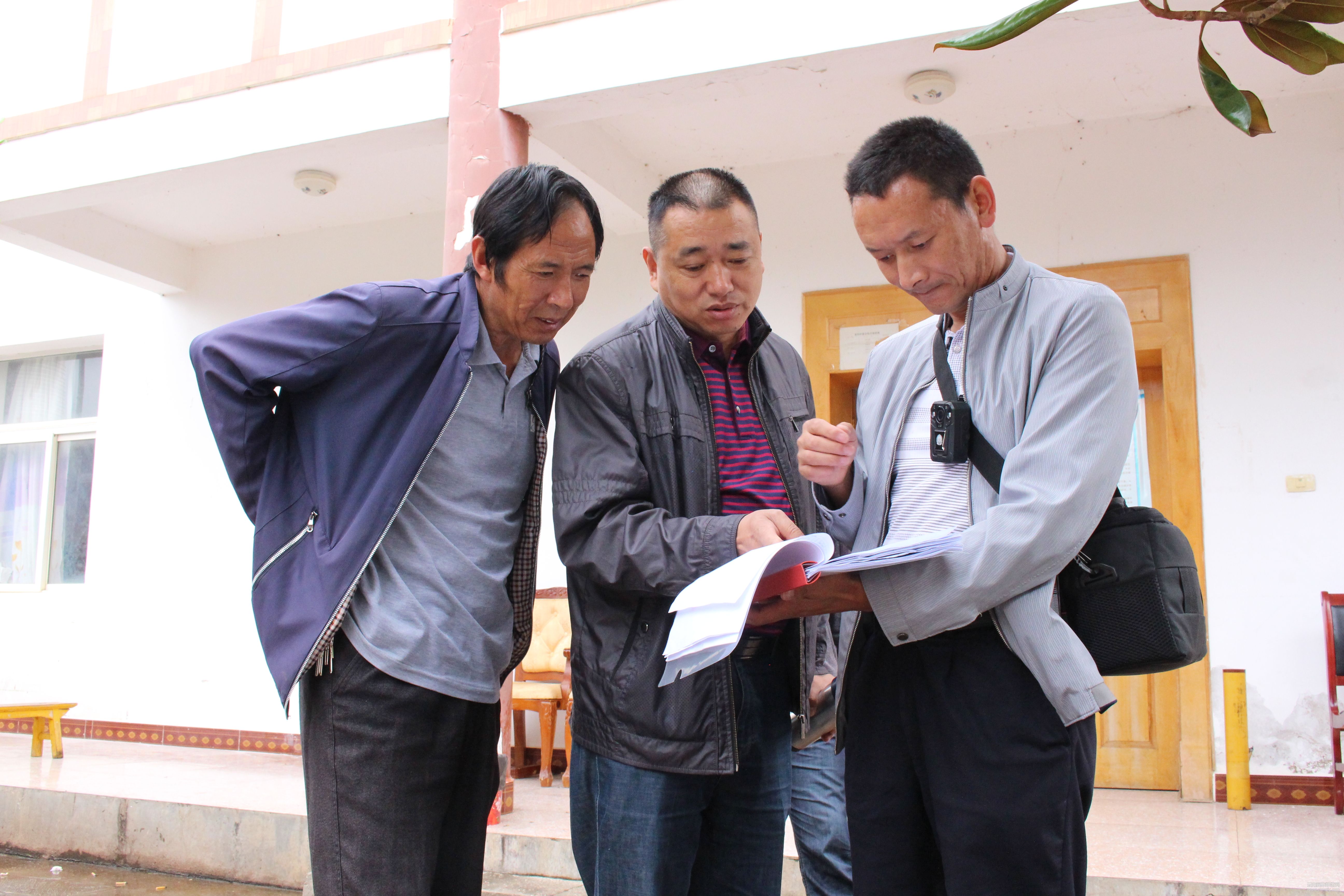副縣長、公安局黨委書記、局長李軍(中)在老君山鎮(zhèn)查閱新和村安防工作臺賬。