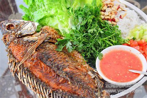 將蔥、姜、蒜、青辣椒、芫荽等佐料切細,放進魚肚子里,用二三根香茅草葉捆好,用竹片夾緊,放在火炭上烘烤,具有香、酥、鮮的特點,是地道的傣家美食。