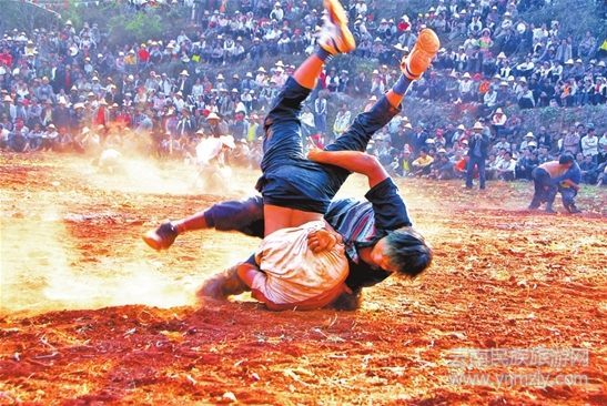彌勒是以彝族為主的少數(shù)民族聚居區(qū)。如同在彝山,出生不久的駿馬就會奔跑一樣,彝族人的孩子剛會說話就學摔跤,在包谷地里摔,在麥秸堆上摔,在山崗草坡上摔,阿爺、阿爹在一旁耳提面命,言傳身教。百里彝山,摔跤英雄輩出。