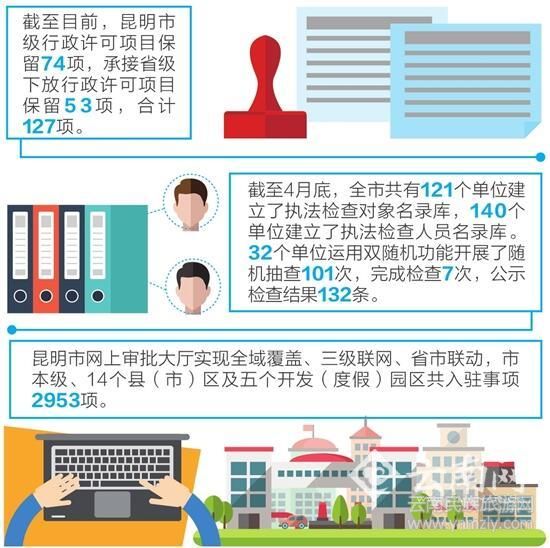 深化“放管服”改革中,昆明市積極落實(shí)承接省政府下放的行政審批事項(xiàng),開展非行政許可和第一批、第二批國務(wù)院要求地方取消中央指定實(shí)施的行政審批事項(xiàng)清理取消工作,深入推動簡政放權(quán),開展政府部門行政職權(quán)清理,全面建立政府權(quán)責(zé)清單制度,市政府35個工作部門和4個政府直屬事業(yè)單位共梳理出行政職權(quán)6829項(xiàng),責(zé)任事項(xiàng)5.7萬余項(xiàng)。全面建立市縣鄉(xiāng)三級政府權(quán)責(zé)清單制度體系。截至目前,昆明市級行政許可項(xiàng)目保留74項(xiàng),承接省級下放行政許可項(xiàng)目保留53項(xiàng),合計(jì)127項(xiàng),企業(yè)和群眾辦事手續(xù)進(jìn)一步簡化,創(chuàng)業(yè)準(zhǔn)入的制度性成本進(jìn)一步降低,政府權(quán)力做“減法”,換來市場和社會活力的“乘法”。