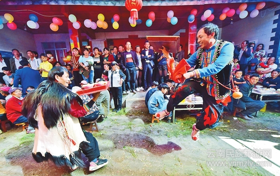 初冬,走進(jìn)南澗縣各村各寨,隨處可聽(tīng)到“南澗跳菜”的音樂(lè)聲,不少彝族群眾忙著籌辦家中的喜事。公郎鎮(zhèn)自強(qiáng)村委會(huì)黃草壩村的查永章、張玉香夫婦帶著跳菜隊(duì),忙著走村入戶給辦喜事的群眾“跳菜”。