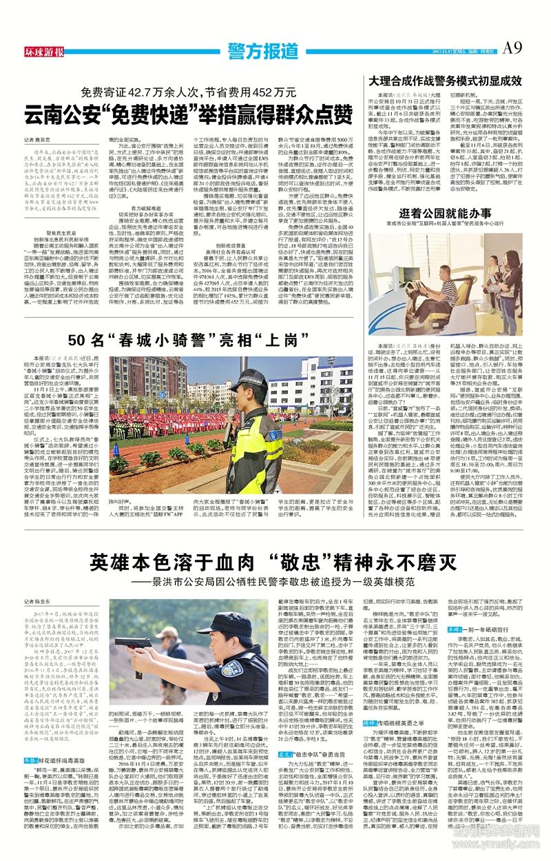 近年來,云南省公安廳圍繞“惠民生、促發(fā)展、方便群眾”的服務理念和要求,在全國率先推出“出入境證件免費快遞”新舉措,被省政府列為2016年十大惠民實事之一。一年來,云南省公安廳為42.7萬余名群眾提供免費快遞證件服務,直接為群眾節(jié)省快遞費用452萬元,間接為群眾節(jié)省交通食宿等費用5000萬余元,受到社會各界的高度贊揚。
