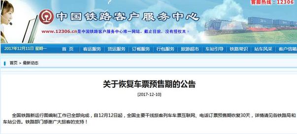 ● 元旦出行可以搶票啦!火車票預售期12月12日起恢復30天 ( 2017-12-12 )