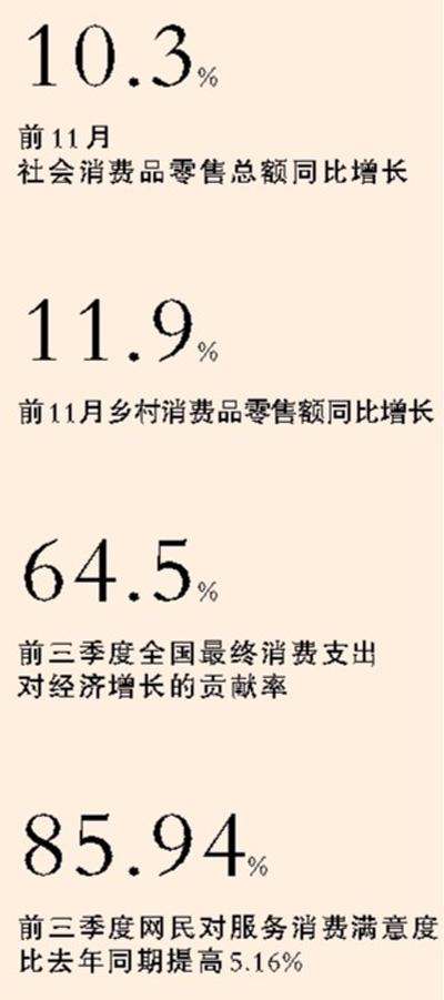 消費(fèi)持續(xù)穩(wěn)中有進(jìn)的態(tài)勢,一方面得益于我國消費(fèi)潛力巨大,另一方面也得益于一系列釋放內(nèi)需潛力的政策初獲成效。“前三季度城鄉(xiāng)居民收入加快增長,消費(fèi)環(huán)境、支持消費(fèi)的政策不斷完善,總體上看消費(fèi)完全有條件延續(xù)目前總量擴(kuò)張、結(jié)構(gòu)升級的發(fā)展態(tài)勢。”國家統(tǒng)計(jì)局新聞發(fā)言人劉愛華說。