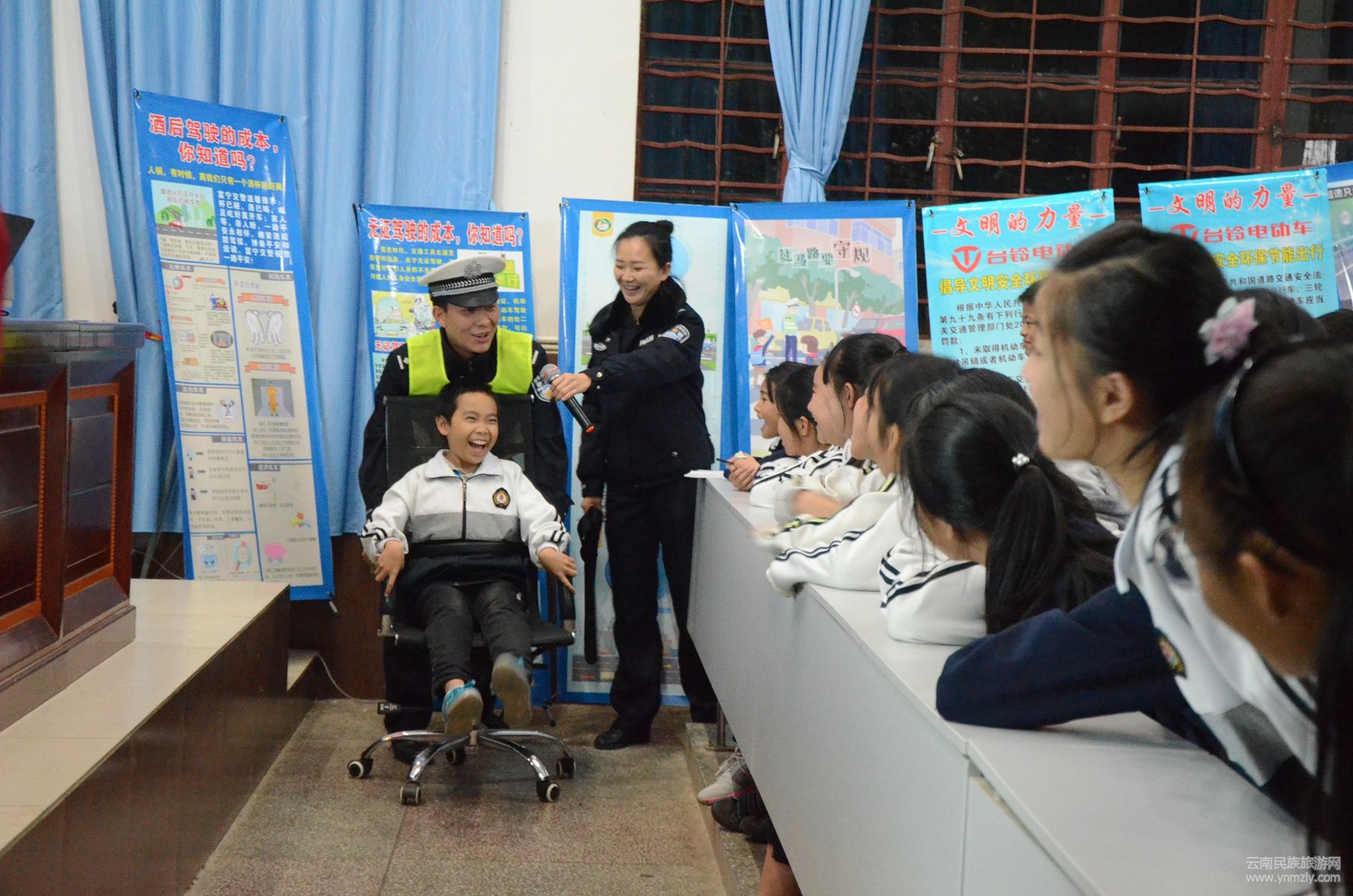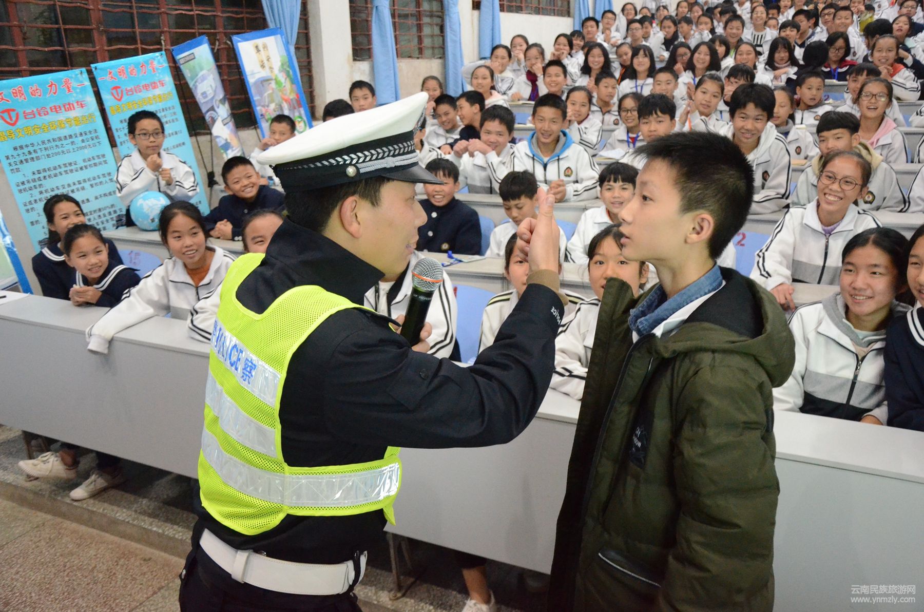 當(dāng)天晚上,宣傳民警首先通過(guò)PPT講解交通安全常識(shí)及涉及學(xué)生的典型交通事故案例,教育學(xué)生做文明人、行文明路,乘車(chē)、騎車(chē)要嚴(yán)格遵守道路交通安全法律、法規(guī)。同時(shí)針對(duì)學(xué)生出行的特點(diǎn),宣傳民警積極與現(xiàn)場(chǎng)學(xué)生互動(dòng),通過(guò)3個(gè)模擬小實(shí)驗(yàn)來(lái)讓學(xué)生感受遵守道路交通安全法律法規(guī)的重要性。首先用頭盔包住西瓜從高空摔下對(duì)比不帶安全頭盔的西瓜從高空摔下時(shí)的狀態(tài),警示教育駕乘摩托車(chē)佩戴安全頭盔的重要性。再來(lái),抽取1名學(xué)生上臺(tái)坐在旋轉(zhuǎn)椅上在不做任何保護(hù)措施的前提下推動(dòng)椅子高速前進(jìn)對(duì)比采取皮帶固定身體的前提下推動(dòng)椅子高速前進(jìn)的狀態(tài),警示教育學(xué)生系安全帶的重要性。最后抽取2名學(xué)生上臺(tái)原地做“大象鼻子”的動(dòng)作15圈,再起身看是否還能筆直行走,模擬酒駕。學(xué)生們都紛紛表示感同身受,今后一定遵守道路交通安全法律法規(guī),摒棄不文明的安全陋習(xí)。宣傳民警號(hào)召?gòu)V大學(xué)生積極行動(dòng)起來(lái),帶動(dòng)父母、家人及身邊的朋友,時(shí)刻牢記安全第一的觀念,摒棄不良交通陋習(xí),做守法、守規(guī)的交通參與者。最后宣傳民警向?qū)W生發(fā)放了《中小學(xué)生交通安全教育讀本》。