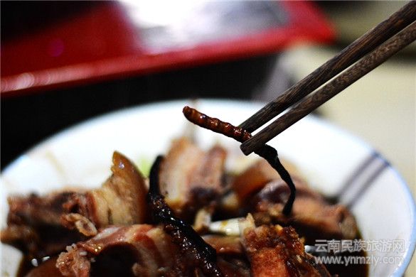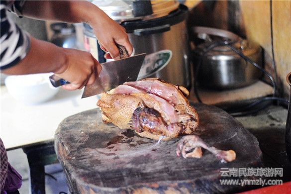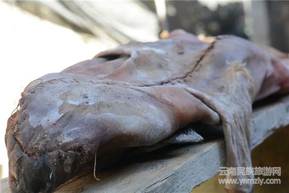 “琵琶肉”,是一種用傳統(tǒng)腌制方法制作而成的肉制品。在怒族人過大年三十時(shí),豐盛的晚餐桌上總會有一道肉色油亮鮮紅、肉味濃烈香鮮、非常可口的腌肉,也就是怒族人制作的琵琶肉。琶琵肉腌制方法是:將宰殺后的豬刮毛洗凈,開膛取出內(nèi)臟,剔去骨頭。然后撒上用花椒、胡椒、草果、鹽等調(diào)制的佐料面,還要抹上燒酒。用線把刀口縫好。在豬耳朵里各塞上一個(gè)核桃,在豬鼻孔里也各插一根粗細(xì)剛好能塞嚴(yán)鼻孔的小木棍。放幾天之后,取出木棍,灌一些鹽水進(jìn)去,再塞嚴(yán)木棍。同時(shí)在針線縫合處涂上一些核桃油。如此反復(fù)數(shù)次后,就可放在火塘篾笆上熏或晾在房頭,等到干了之后即成一具完整的琵琶肉。一般情況下,頭年腋制的琵琶肉要到大年三十晚上才食用。