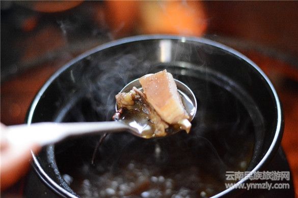 在豐紹珍的院子中,一頭縫得完好的豬晾在院子里,空氣中飄來香味。忙問豐紹珍這是什么,她笑著回答說“琵琶肉”。大家一邊圍著火塘喝著剛剛烹煮出來的霞拉,豐紹珍給我們用蟲草燉琵琶肉,一會兒的功夫,廚房里都是“琵琶肉”的香味。豐紹珍回憶說,小時(shí)候每到過年前,家里都會做一些琵琶肉存放著,這是他們當(dāng)?shù)氐膫鹘y(tǒng)美食。