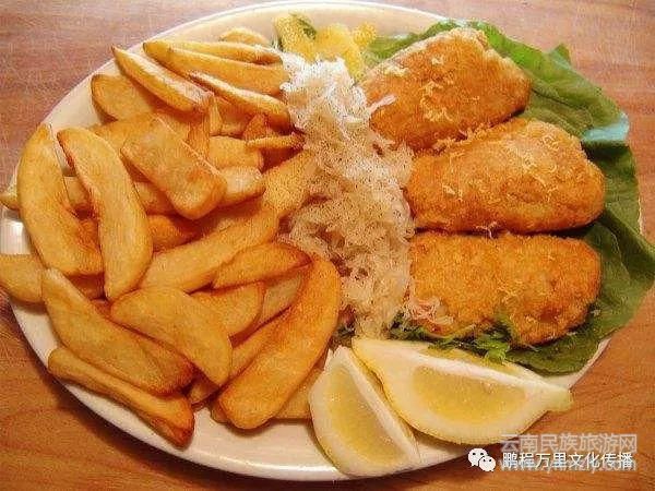 英國炸魚薯條,炸魚薯條源自英國,是將去了魚刺和骨頭的魚,切成片后裹上濕面團,然后油炸,吃的時候還會配上不同口味的調(diào)味醬,算是種很普遍的街邊小吃。