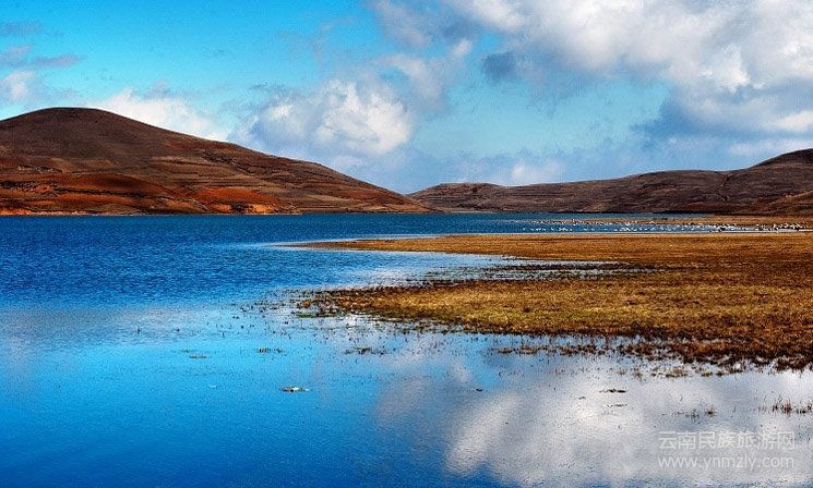 大寶山更是世界瀕危珍稀物種黑頸鶴的溫馨家園。在跳墩河水庫、大海子水庫兩個地方可看到成群結(jié)隊(duì)的黑頸鶴在湖邊覓食、棲息,碩大的羽翼展翅于碧海藍(lán)天間,傲然飛翔。