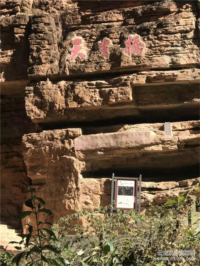 本來(lái)橫斷的峽谷,被一塊大石所填滿(mǎn),“在整段大裂谷中,唯有這里一塊天然巨石橫亙?cè)趦山^壁的中央,成為了連通兩邊的唯一通道,這就是天生橋。”小鳳介紹道。絕壁上用草書(shū)提著一首關(guān)于天生橋的詩(shī):“刀削斧劈兩相望,上下百里不曾連。獨(dú)有此處手牽手,原是牽牛織女橋”。