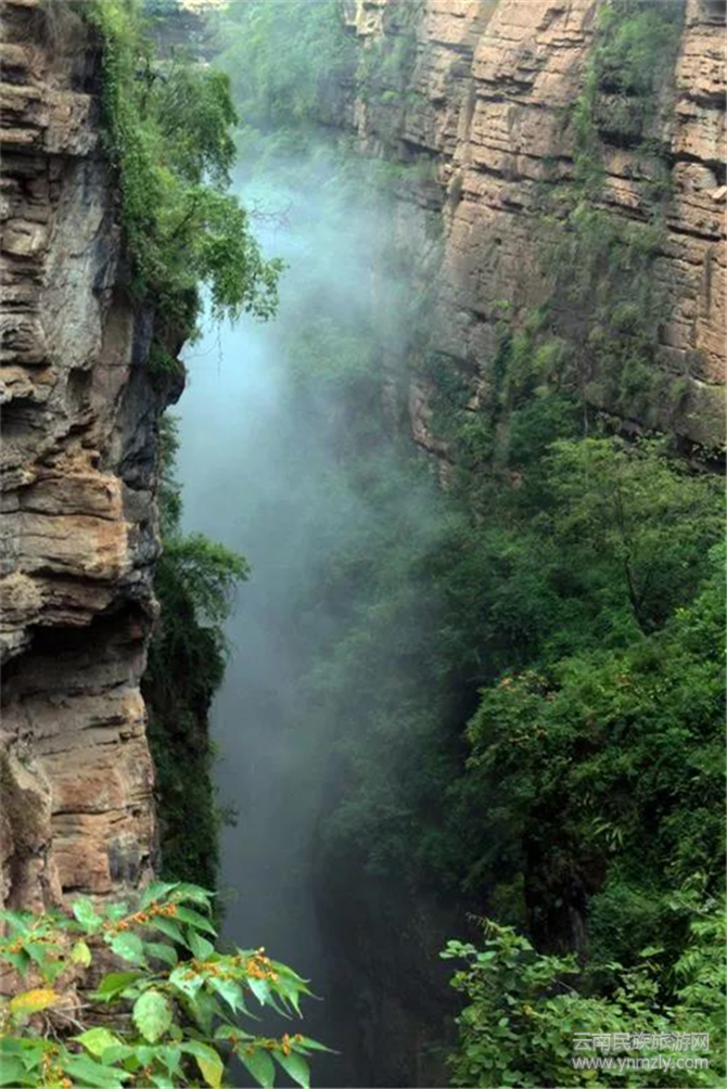 環(huán)看四周峭壁,真的像被刀削過(guò)一樣。絕壁上一道瀑布從谷頂順流而下流入谷底深處,雖然隱約能聽(tīng)到河在腳下的流水聲,但我們卻看不到河水,真是神秘莫測(cè)。瀑布沖刷在絕壁上濺起的水,被微風(fēng)吹散在空氣中形成了細(xì)小的水珠,這就是剛剛帶來(lái)涼爽的源頭。