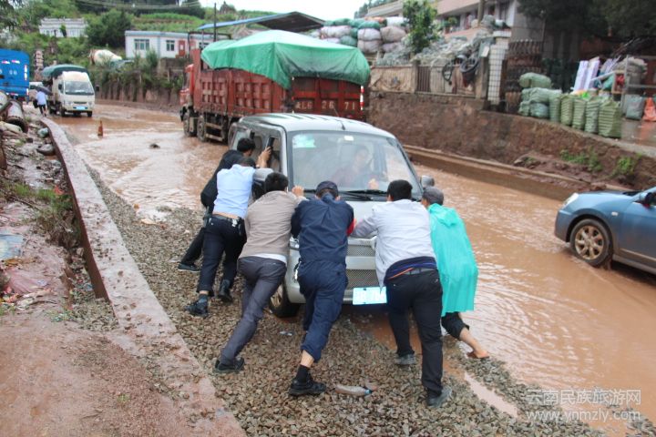 2017年7月9日,由于連日強(qiáng)降雨,南華縣沙橋鎮(zhèn)轄區(qū)道路路面積水嚴(yán)重,針對極端天氣,為確保過境道路暢通,南華縣公安機(jī)關(guān)全面加強(qiáng)路面巡邏。當(dāng)日17時(shí)許,沙橋派出所民警巡邏至320國道鵝毛樹路段時(shí),發(fā)現(xiàn)一輛微型面包車后輪陷在水塘的碎石中,無法動(dòng)彈。看到這一情況,巡邏民警立即下車,查看車輛情況后,不顧泥滑路爛召集路邊群眾一起將受困車輛推出水塘。