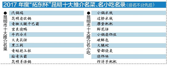 4月28日,云南省餐飲與美食行業(yè)協(xié)會(huì)、昆明市餐飲與美食行業(yè)協(xié)會(huì)在昆明國(guó)際會(huì)展中心舉辦了“2017年昆明十大推介名菜、名小吃”評(píng)選推介活動(dòng),以《昆明十大推介名菜、名小吃制作指導(dǎo)規(guī)范》為評(píng)判標(biāo)準(zhǔn),組織昆明市的賓館、飯店、餐飲企業(yè)、機(jī)關(guān)食堂及團(tuán)膳企業(yè)等,為昆明市民和廣大游客評(píng)選出一批特色鮮明、口味正宗的昆明名菜、名小吃制作售賣(mài)企業(yè),并授權(quán)41家企業(yè)制作售賣(mài)“2017年昆明十大推介名菜或名小吃”,頒發(fā)榮譽(yù)牌、證。