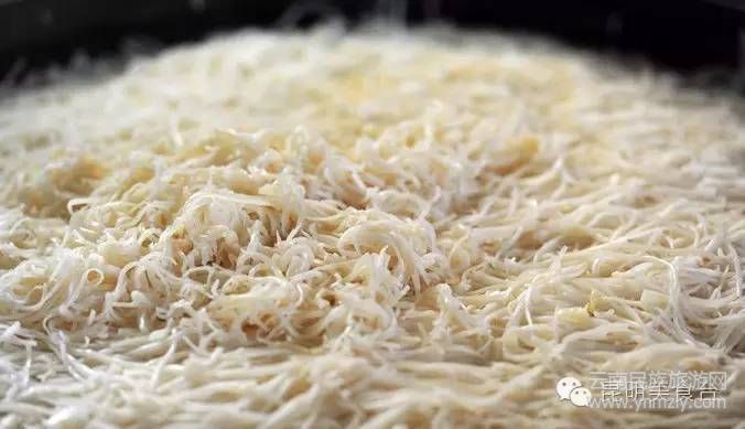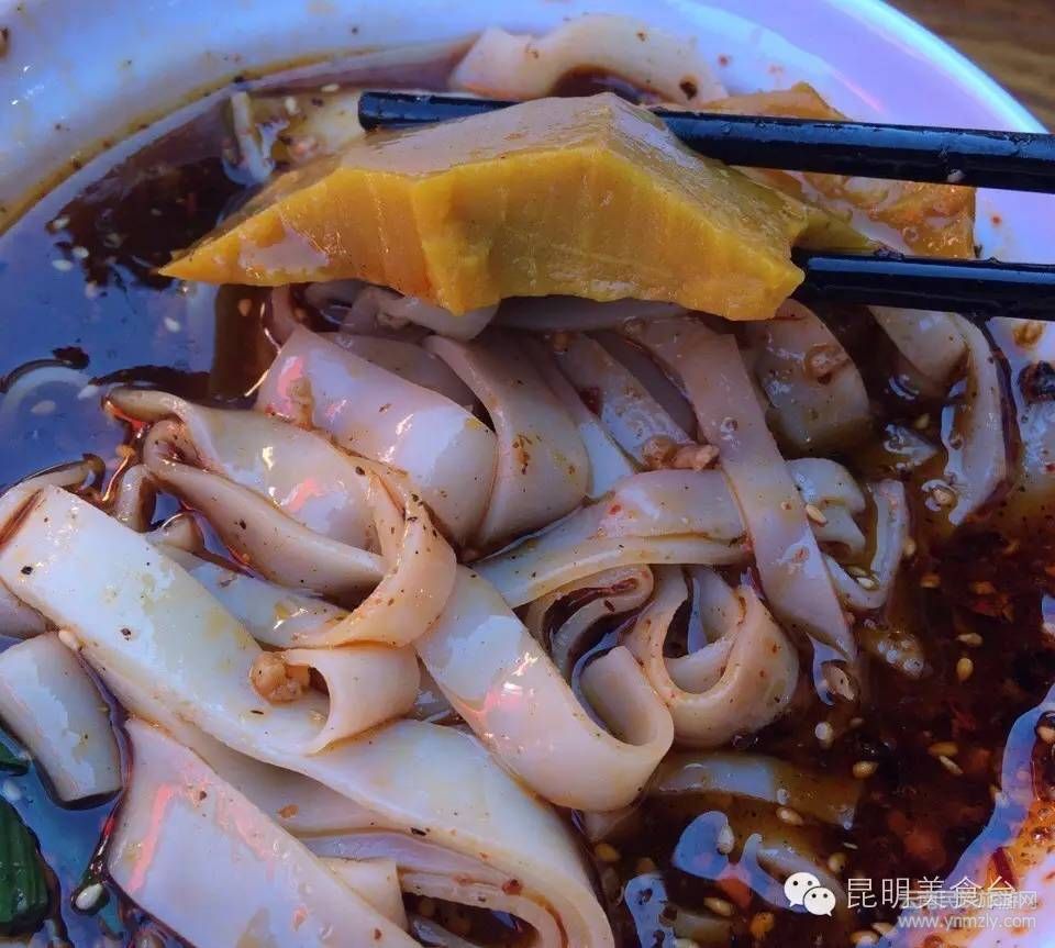 玉溪的老店“洪記”,以涼米線馳名:先在一團(tuán)米線上碼韭菜,再蓋一大片厚豌豆涼粉,依次放入甜子(自制酸醋)、甜醬油、芝麻醬、鹽水,最后淋一勺帶油渣的油辣子。