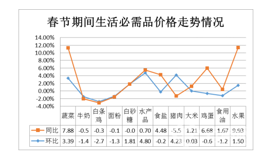 節(jié)日期間,糧油、禽蛋、蔬菜、肉類、水產(chǎn)品等生活必需品價(jià)格總體平穩(wěn)。所監(jiān)測(cè)的12類重要生活必需品價(jià)格呈6漲6跌的態(tài)勢(shì),其中,蔬菜、白砂糖、水產(chǎn)品、豬肉、大米、水果市場(chǎng)零售價(jià)格與節(jié)前相比均上漲,漲幅分別為3.39%、1.81%、4.8%、4.23%、0.03%、1.5%;牛奶、白條雞、面粉、食鹽、鮮雞蛋、食用油市場(chǎng)零售價(jià)格與節(jié)前相比下跌,跌幅分別為1.42%、2.76%、1.37%、0.21%、0.67%、1.25%。