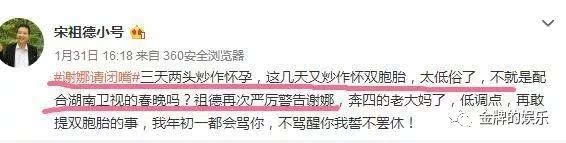 而這其中,宋祖德的話,估計也代表了一些聲音,在這幾天的微博上,宋祖德就直言,謝娜三番兩次的炒作雙胞胎的消息,最終的目的是要配合湖南衛(wèi)視的春晚。