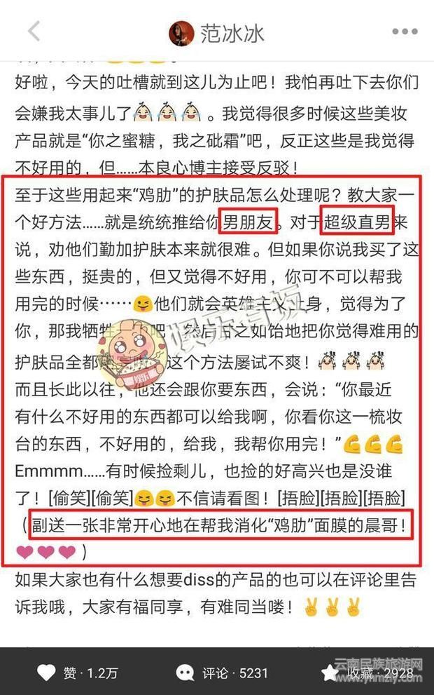 搜狐娛樂訊 日前,范冰冰在某平臺分享自己的護(hù)膚心得,提到了不少自己認(rèn)為“雞肋”的產(chǎn)品,并友情提示大家這些產(chǎn)品的處理方法:送給男朋友!
