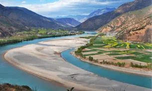 奔騰而下的長(zhǎng)江在石鼓鎮(zhèn)被海羅山崖阻擋后急轉(zhuǎn)成一個(gè)"V"字形大彎,折頭向東北流去,形成了聞名的萬(wàn)里長(zhǎng)江第一灣。