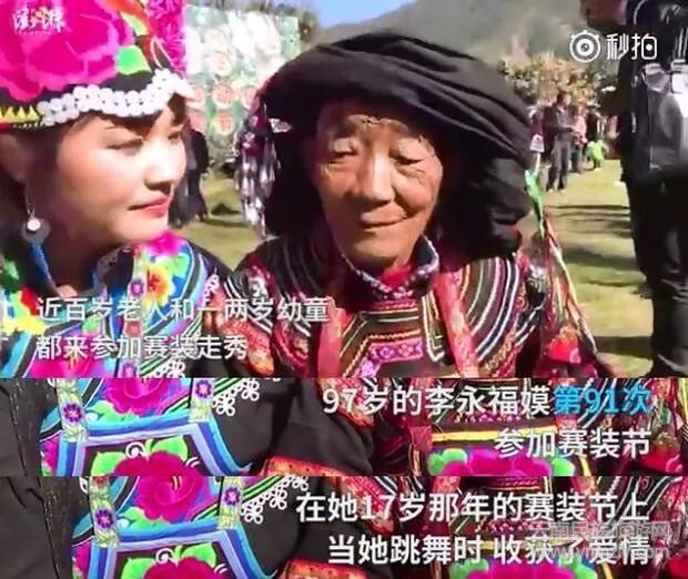 圖中是97歲的李永福嫫和她的重孫女兒,這已經(jīng)是李永福嫫第91次來參加賽裝節(jié)了,17歲,她在賽裝節(jié)上邂逅了自己的愛情,數(shù)載過去,每年的正月十五來賽裝、跳舞,對她來說仍是雷打不動(dòng)的事。