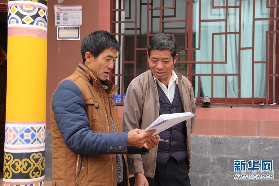 村支書賴學(xué)文(左)向村民宣傳森林防火知識。新華網(wǎng) 念新洪 攝