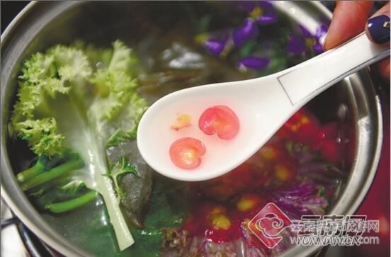 在嵩明花博園,滿桌鮮花食材,艷麗繽紛五彩十色。落座后安靜地欣賞,誰也不愿動第一筷。火鍋是每人一個,五彩十色的花盡管往里投,滿滿一桌鮮花宴400元,人均消費僅40元。