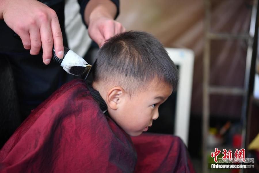 3月18日,小男孩剃龍頭。當(dāng)日是農(nóng)歷二月初二,俗稱“龍?zhí)ь^”,民間有剃龍頭習(xí)俗,昆明街頭一美發(fā)室里擠滿剪頭的市民。中新社記者劉冉陽(yáng) 攝
