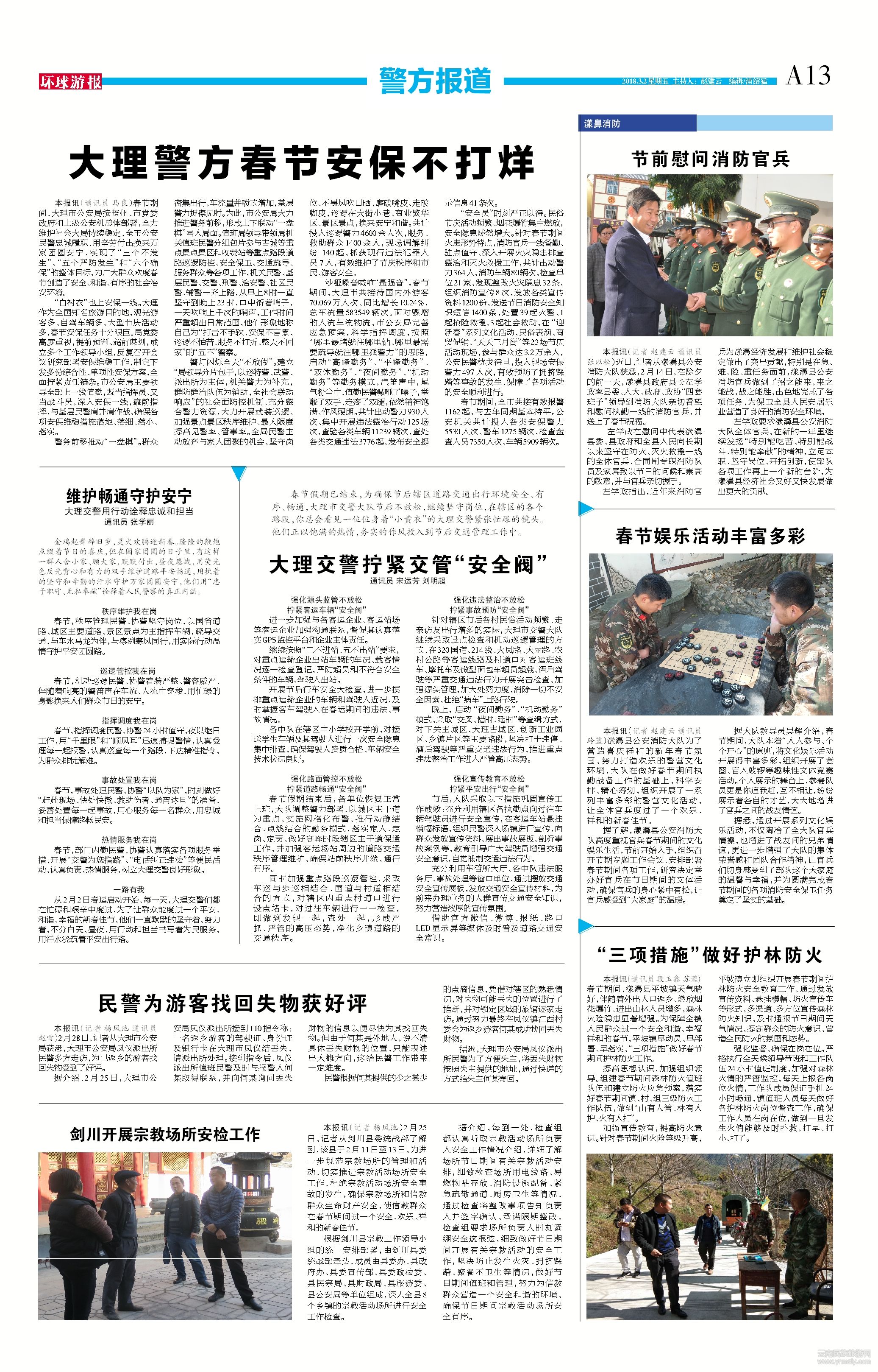 “安全員”時刻嚴正以待。民俗節(jié)慶活動頻繁、煙花爆竹集中燃放,安全隱患陡然增大。針對春節(jié)期間火患形勢特點,消防官兵一線備勤、駐點值守、深入開展火災隱患排查整治和滅火救援工作,共計出動警力364人,消防車輛80輛次,檢查單位21家,發(fā)現(xiàn)整改火災隱患32條,組織消防宣傳8次,發(fā)放各類宣傳資料1200份,發(fā)送節(jié)日消防安全知識短信1400條,處置39起火警、1起搶險救援、3起社會救助。在 “迎新春”系列文化活動、民俗表演、商貿(mào)促銷、“天天三月街”等23場節(jié)慶活動現(xiàn)場,參與群眾達3.2萬余人,公安民警枕戈待旦,投入現(xiàn)場安保警力497人次,有效預防了擁擠踩踏等事故的發(fā)生,保障了各項活動的安全順利進行。