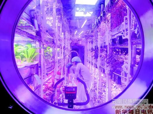 照片中紫紅色的光是根據(jù)植物生長(zhǎng)狀況調(diào)節(jié)而成的人造光源,控制了植物的生長(zhǎng)速率,也就保證了實(shí)驗(yàn)艙內(nèi)氧氣的含量。