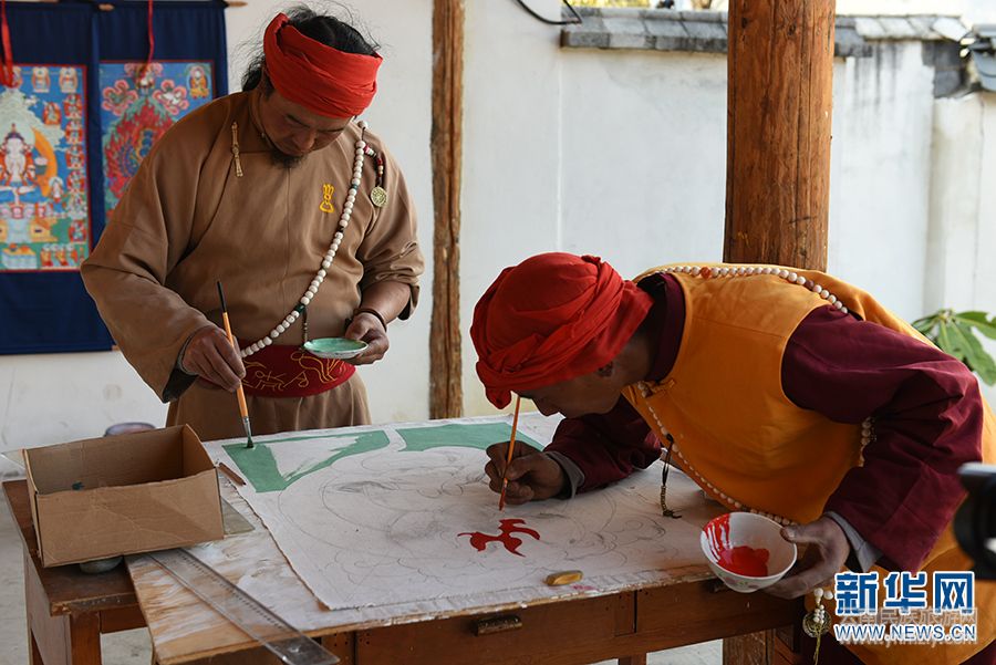 東巴畫(huà)傳承人和嘉龍(右)和楊正元一起上色。新華網(wǎng) 李寧 攝