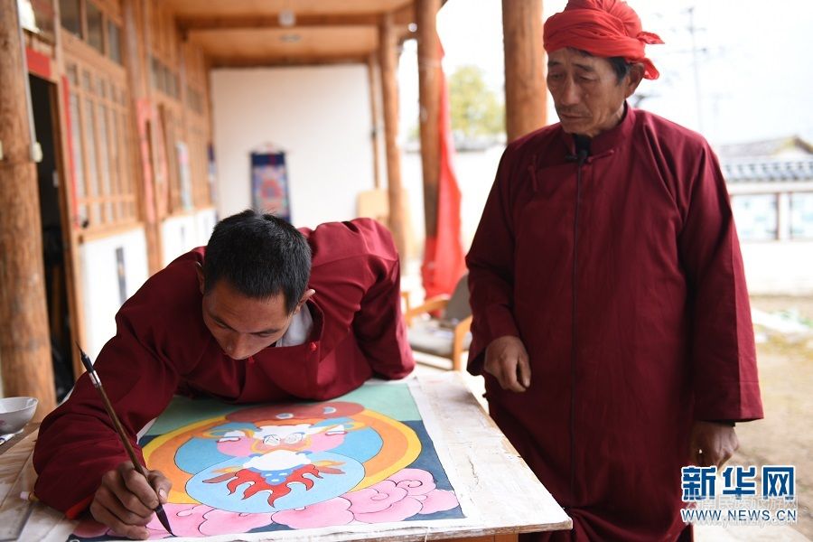 顏色上好后,還要再勾畫(huà)一遍線條。圖為云南省麗江市東巴畫(huà)省級(jí)非遺傳承人和圣典指點(diǎn)和嘉龍勾畫(huà)線條。(新華網(wǎng) 韓文萍、馬航/文 李寧/圖)