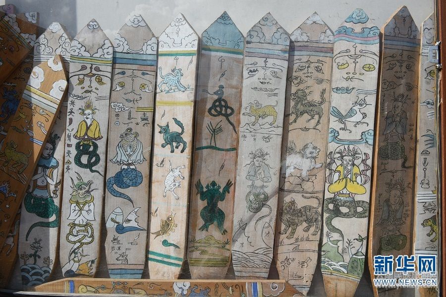 木牌畫(huà)繪畫(huà)內(nèi)容有自然精靈、日月星辰、山川湖泊、樹(shù)木花卉、人物家畜、飛禽走獸、吉祥圖案等,表現(xiàn)了納西人的生活習(xí)俗和原始崇拜意識(shí)。(新華網(wǎng) 韓文萍、馬航/文 李寧/圖)