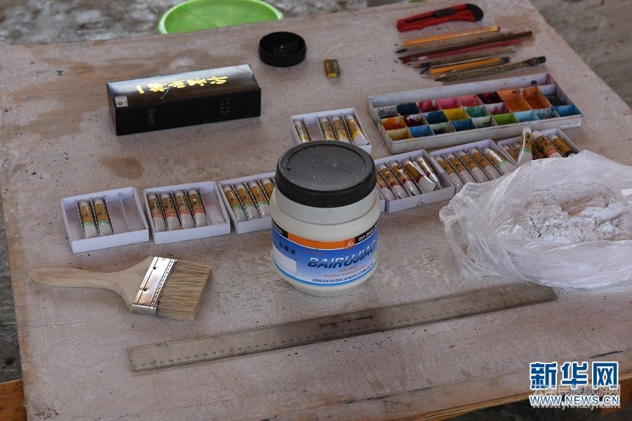 制作不同形式的東巴畫,過程和周期不同。以卷軸畫為例,通常要經(jīng)過上漿、打磨、晾曬、勾線條、上色等過程。圖為制作東巴畫所需的部分工具。(新華網(wǎng) 韓文萍、馬航/文 李寧/圖)
